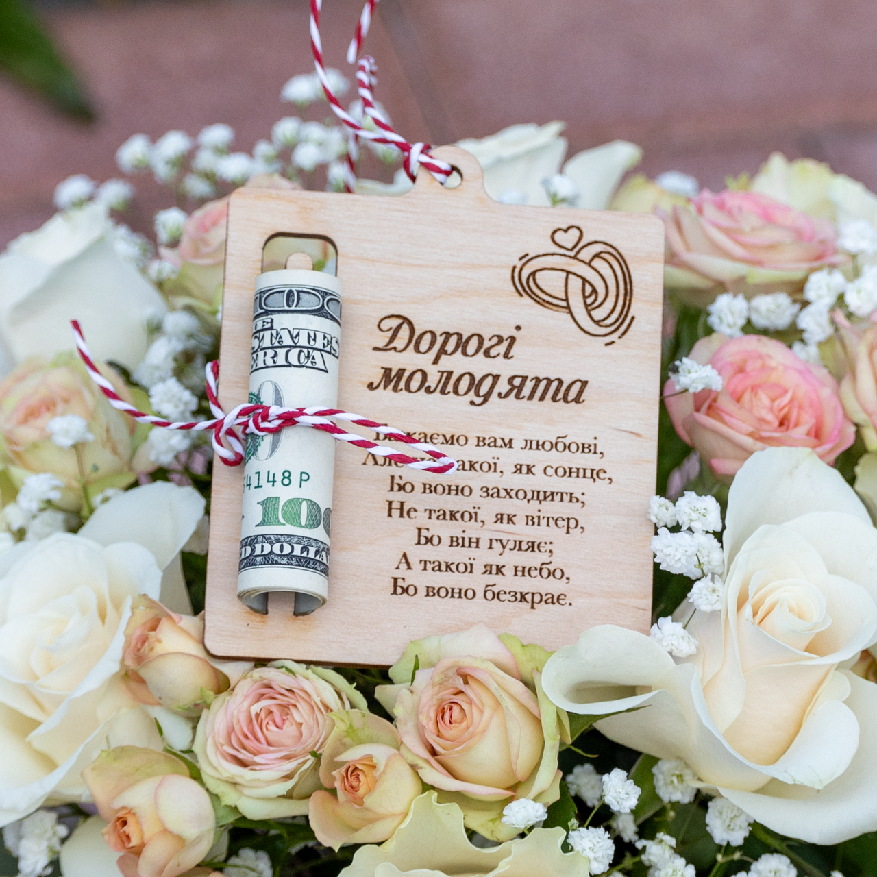 Досі даруєте гроші в конвертах? Ми пропонуємо зробити це креативо! Листівка з дерева з вашим текстом до якої ви можете додати гроші, просто накрутивши їх в спеціальний отвір. Далі гарненько зав'язуємо на 1 "метелик" і чіпляємо до букету з квітами, пляшки з "смачним" чи просто презентуємо молодятам чи імениннику. Як вам така ідея?